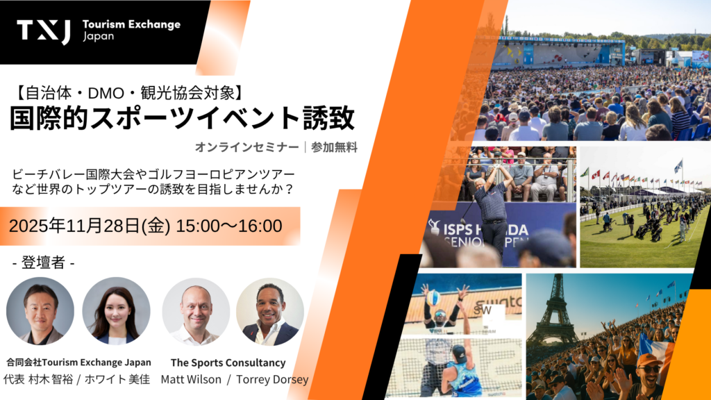 合同会社Tourism Exchange Japanは、自治体・DMO・観光協会等の皆さまを対象にオンラインセミナー「国際的スポーツイベント誘致」を、2025年11月28日(金)に開催いたします。