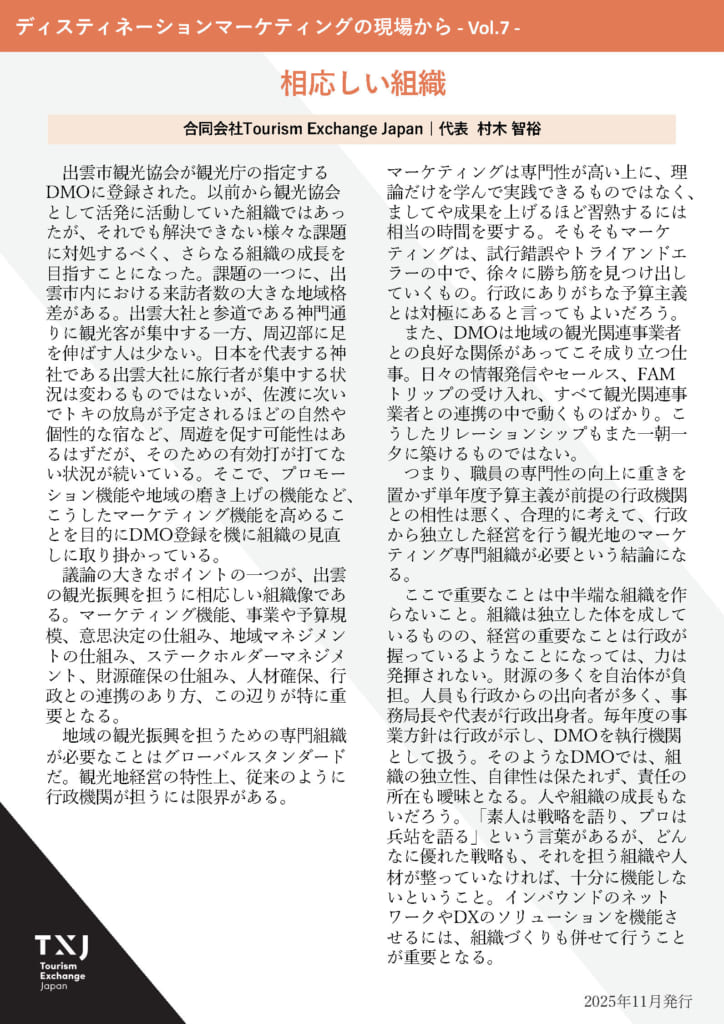 弊社の代表 村木のコラム「ディスティネーションマーケティングの現場から – Vol.7 -」を公開しました。